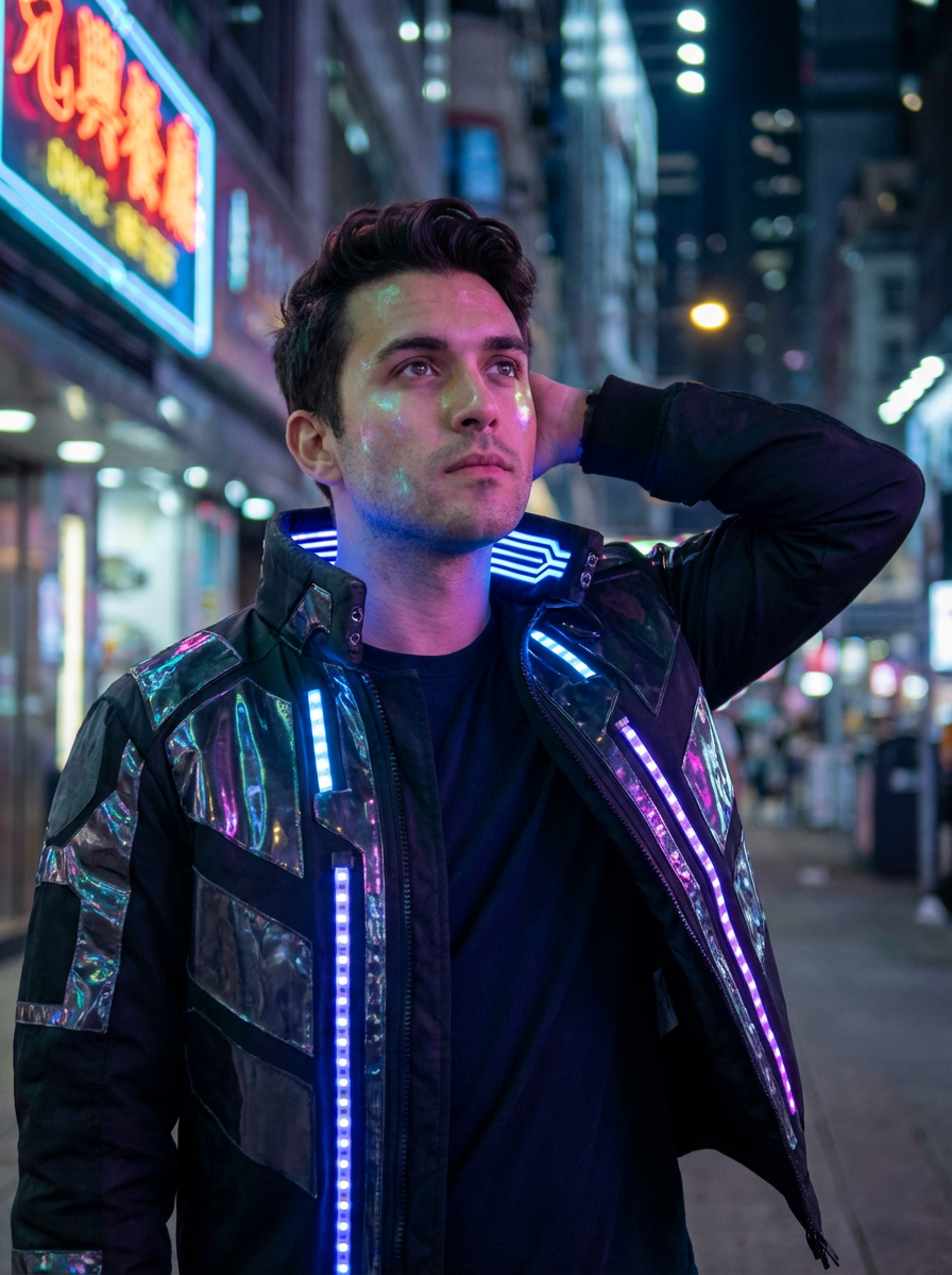 model for electronic music cover, futuristic aesthetic, neon lights, cyberpunk influence, modern edgy