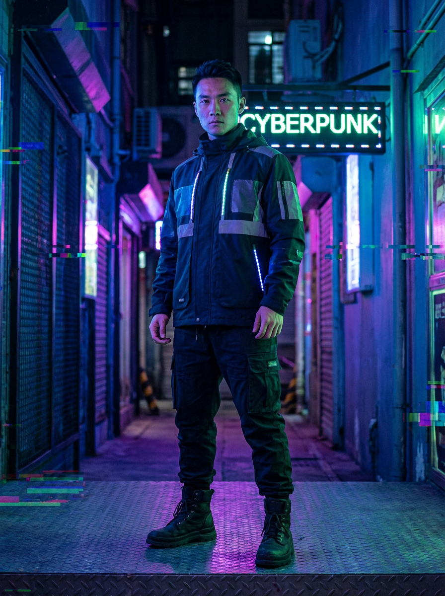 model for electronic music cover, futuristic aesthetic, neon lights, cyberpunk influence, modern edgy