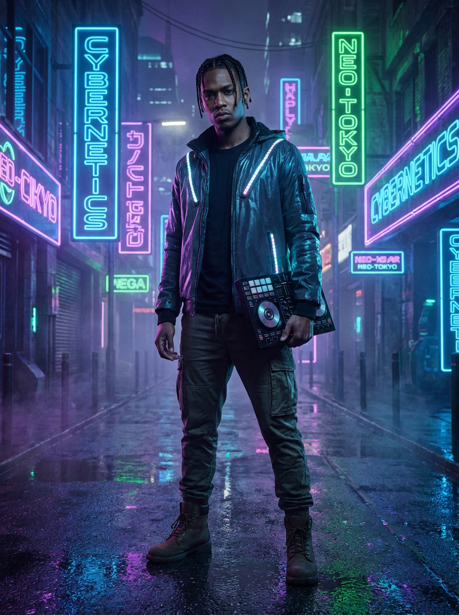 model for electronic music cover, futuristic aesthetic, neon lights, cyberpunk influence, modern edgy
