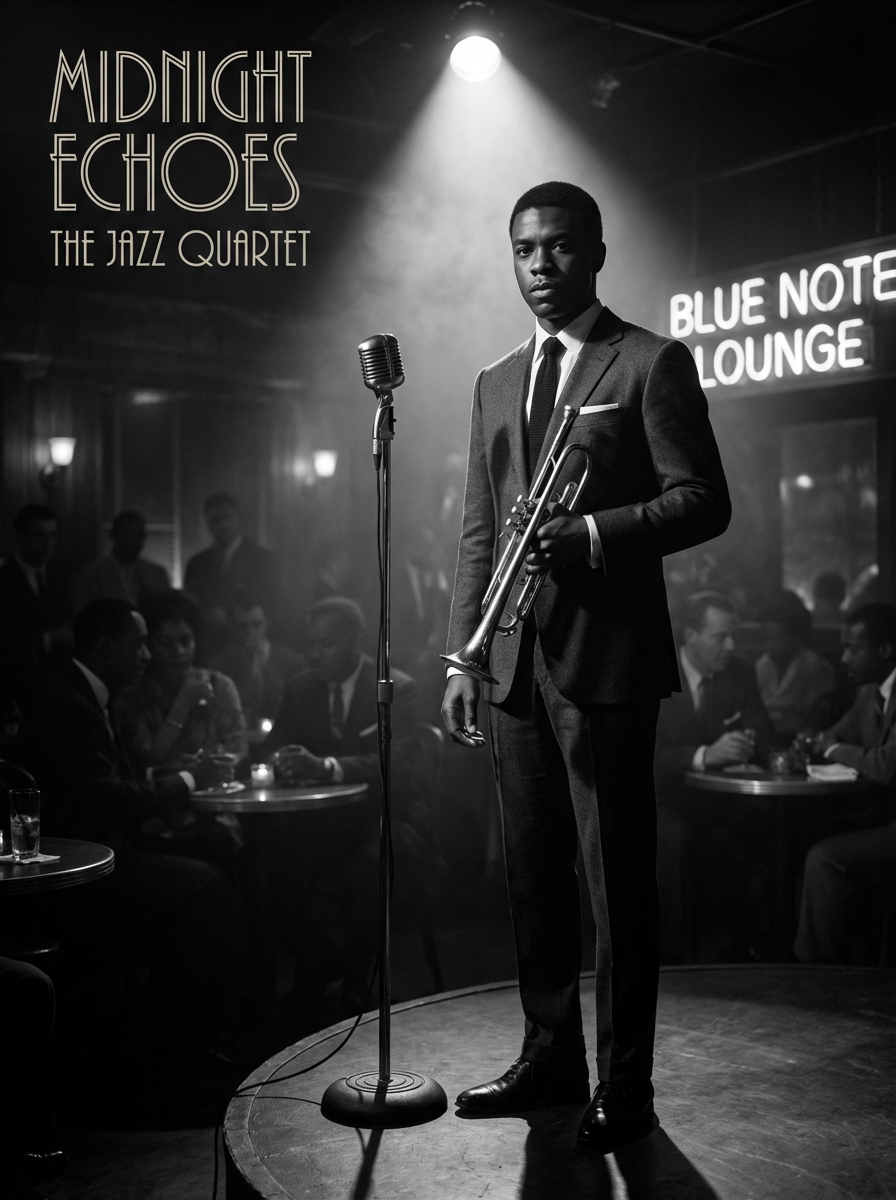 model for jazz album cover, sophisticated noir aesthetic, smoky club vibe, classic timeless style