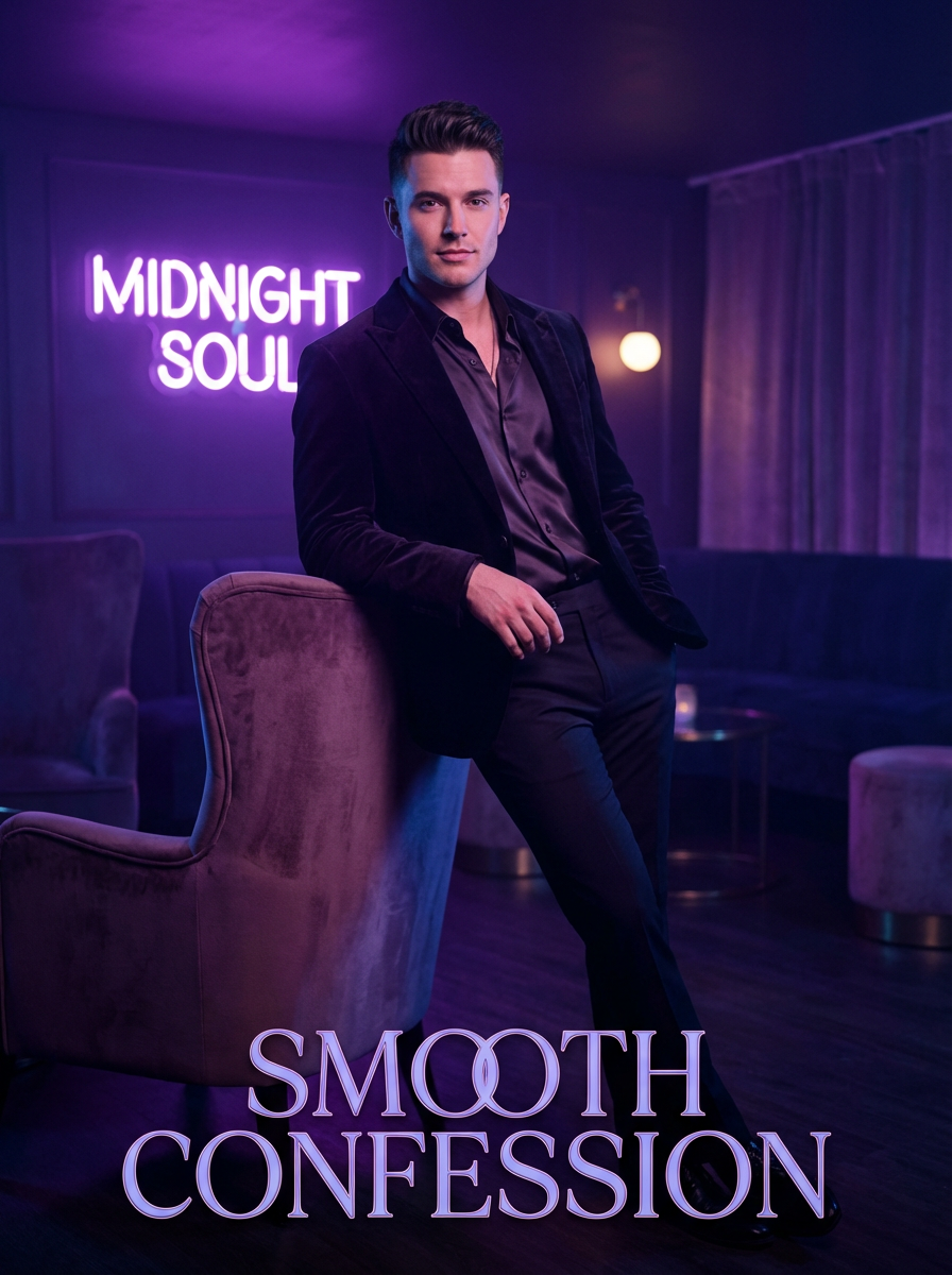 model for R&B album cover, smooth confident look, purple mood lighting, sensual atmosphere