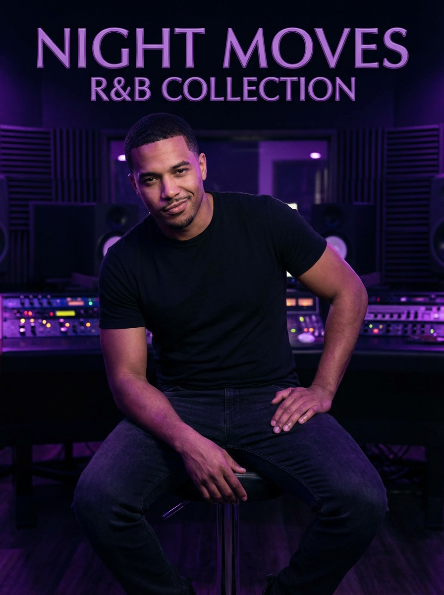 model for R&B album cover, smooth confident look, purple mood lighting, sensual atmosphere