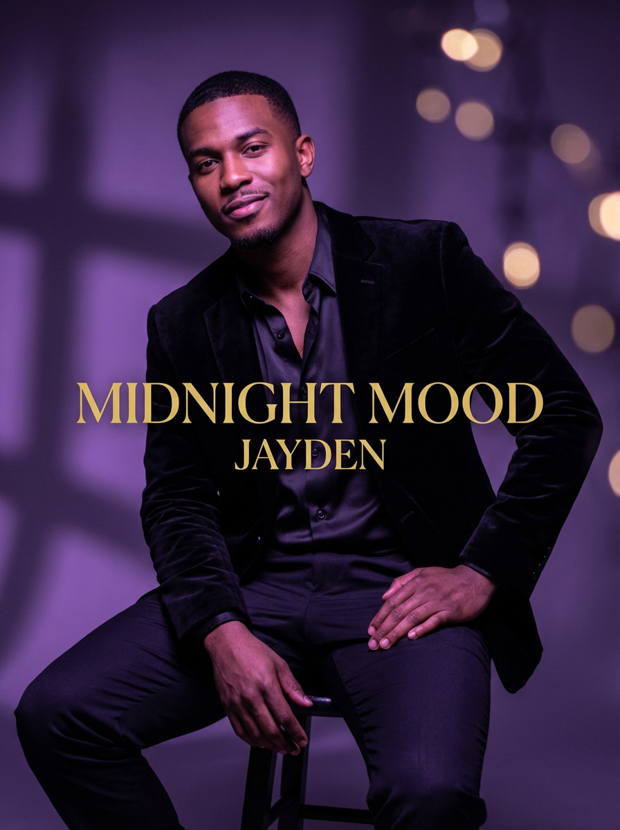 model for R&B album cover, smooth confident look, purple mood lighting, sensual atmosphere