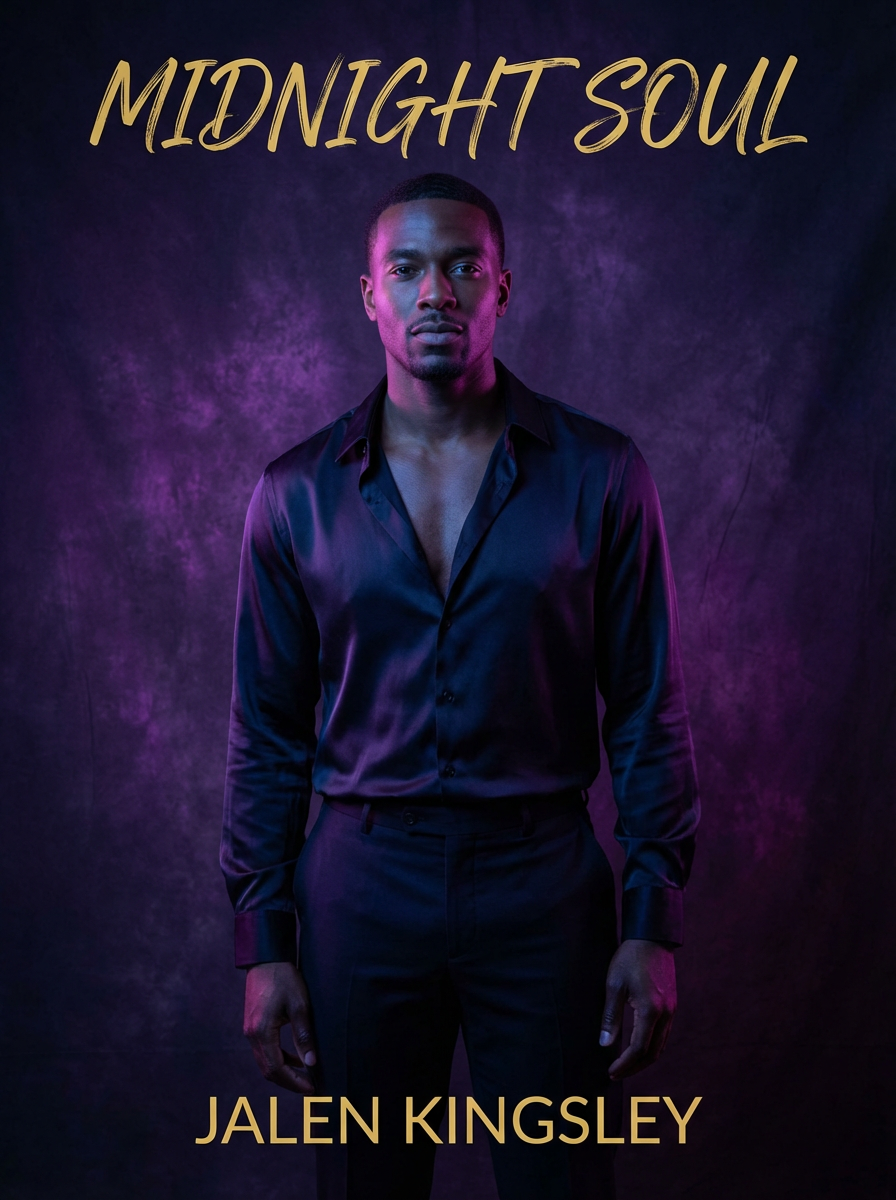 model for R&B album cover, smooth confident look, purple mood lighting, sensual atmosphere