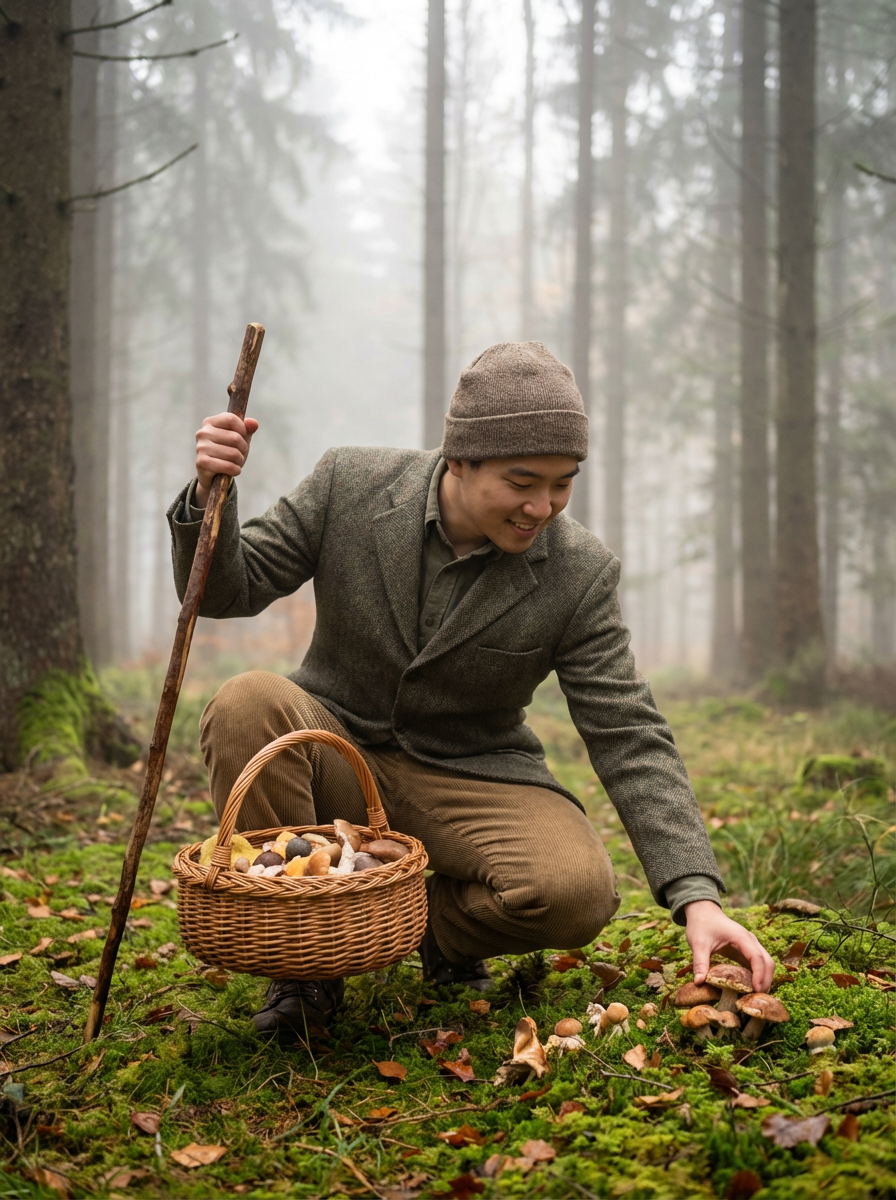 model foraging mushrooms, cottagecore aesthetic, basket and walking stick, misty forest morning