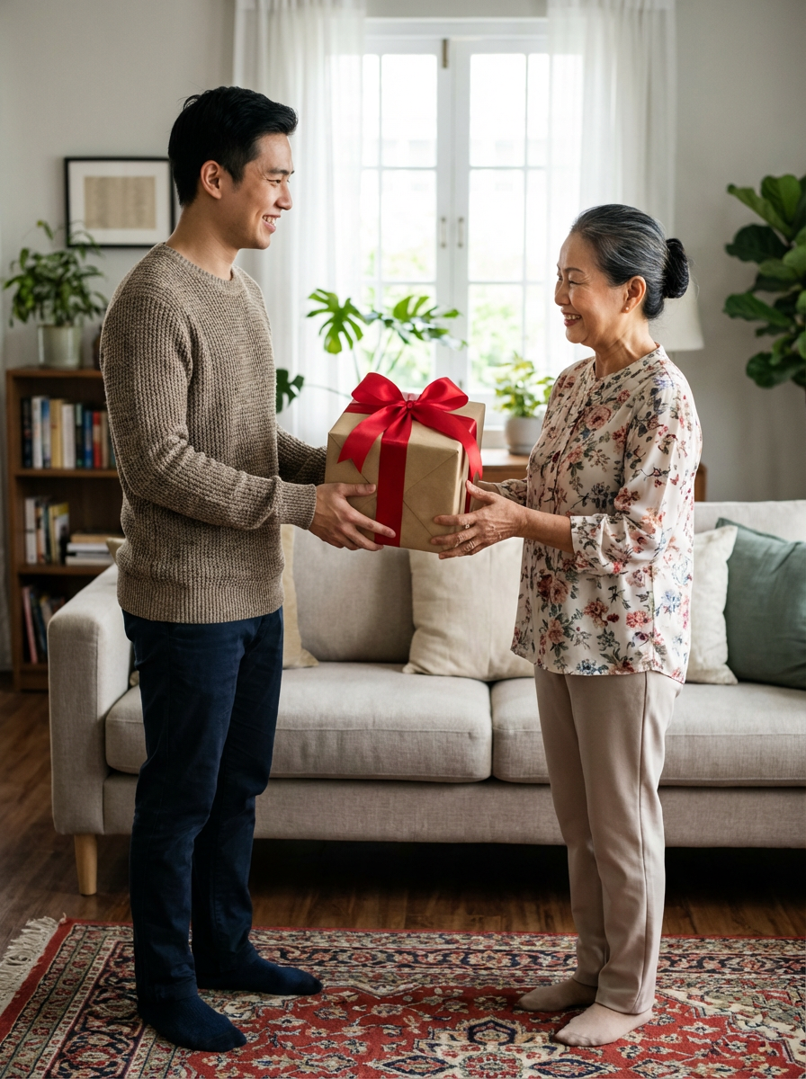 model giving gift to mother figure, wrapped present with bow, loving interaction, home setting