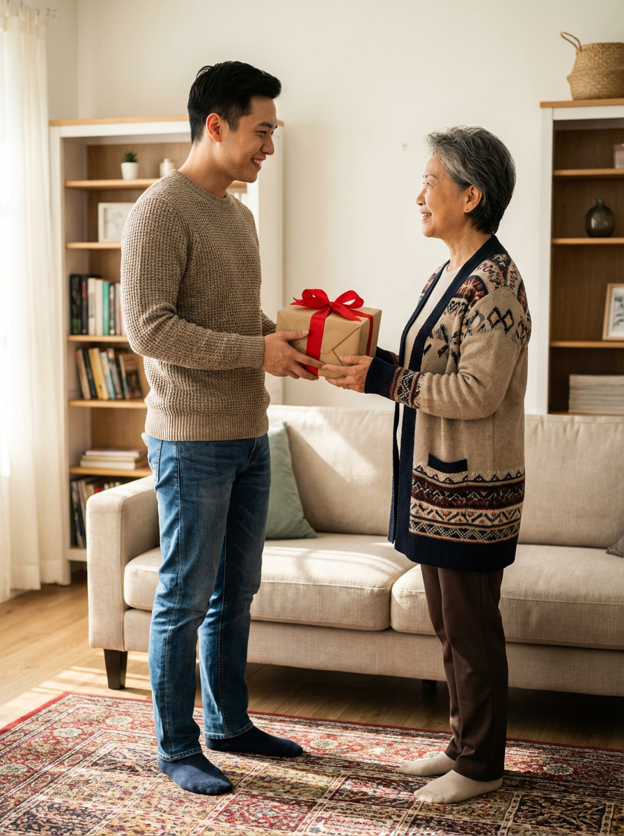 model giving gift to mother figure, wrapped present with bow, loving interaction, home setting