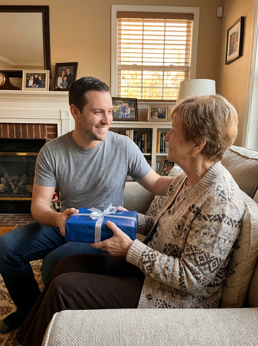 model giving gift to mother figure, wrapped present with bow, loving interaction, home setting