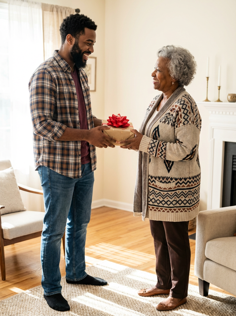model giving gift to mother figure, wrapped present with bow, loving interaction, home setting