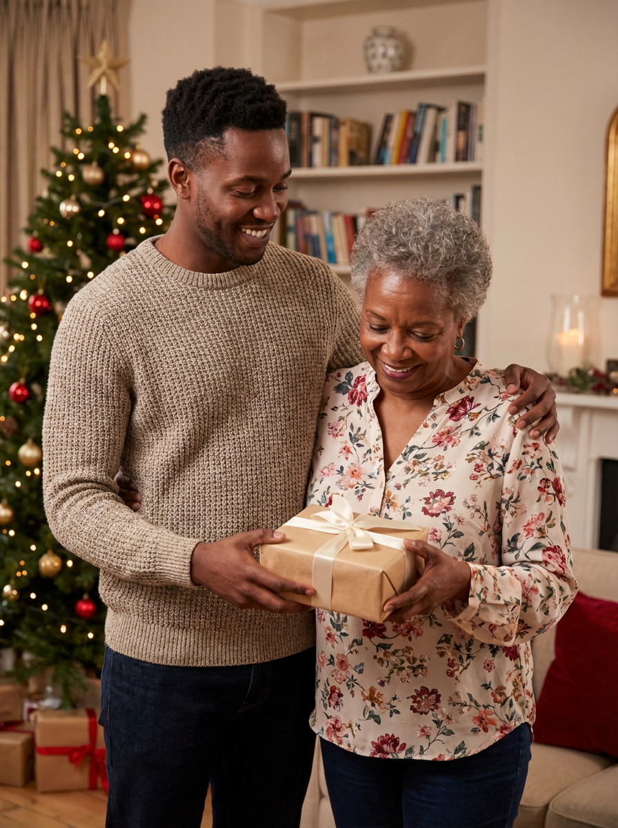 model giving gift to mother figure, wrapped present with bow, loving interaction, home setting
