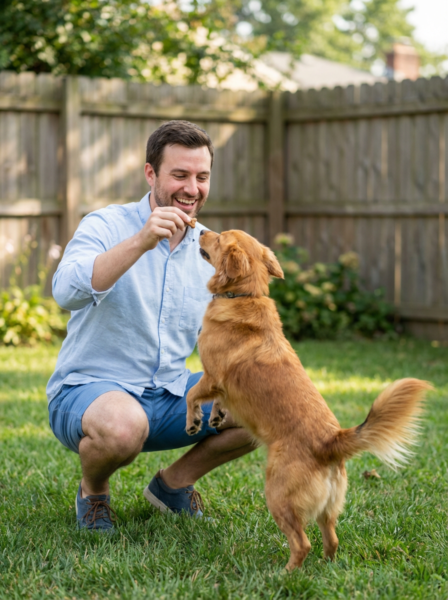 model giving treats to excited dog, training session, backyard setting, positive reinforcement moment