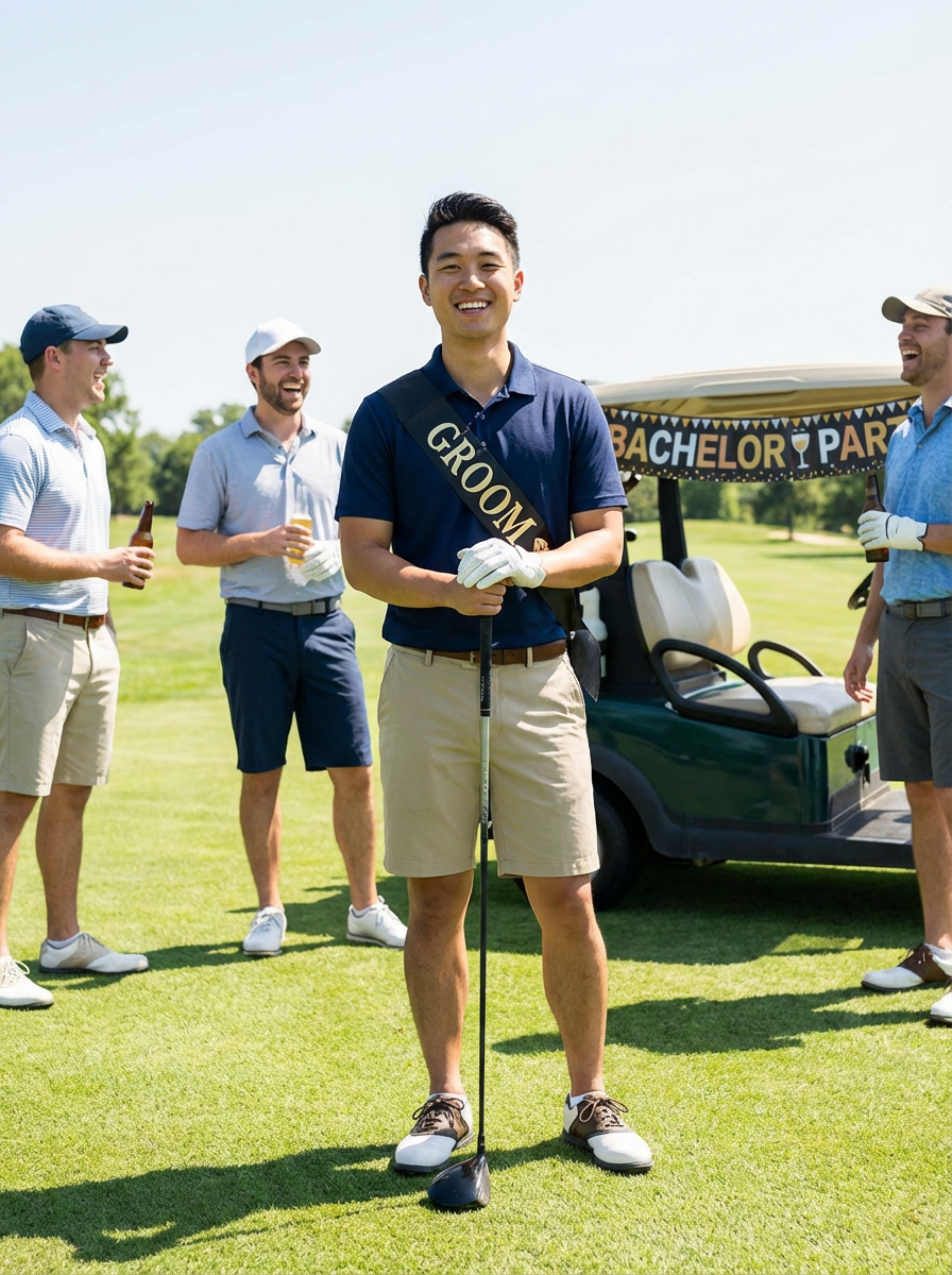 model golfing at bachelor party, golf course setting, polo shirt, sunny day, relaxed celebration