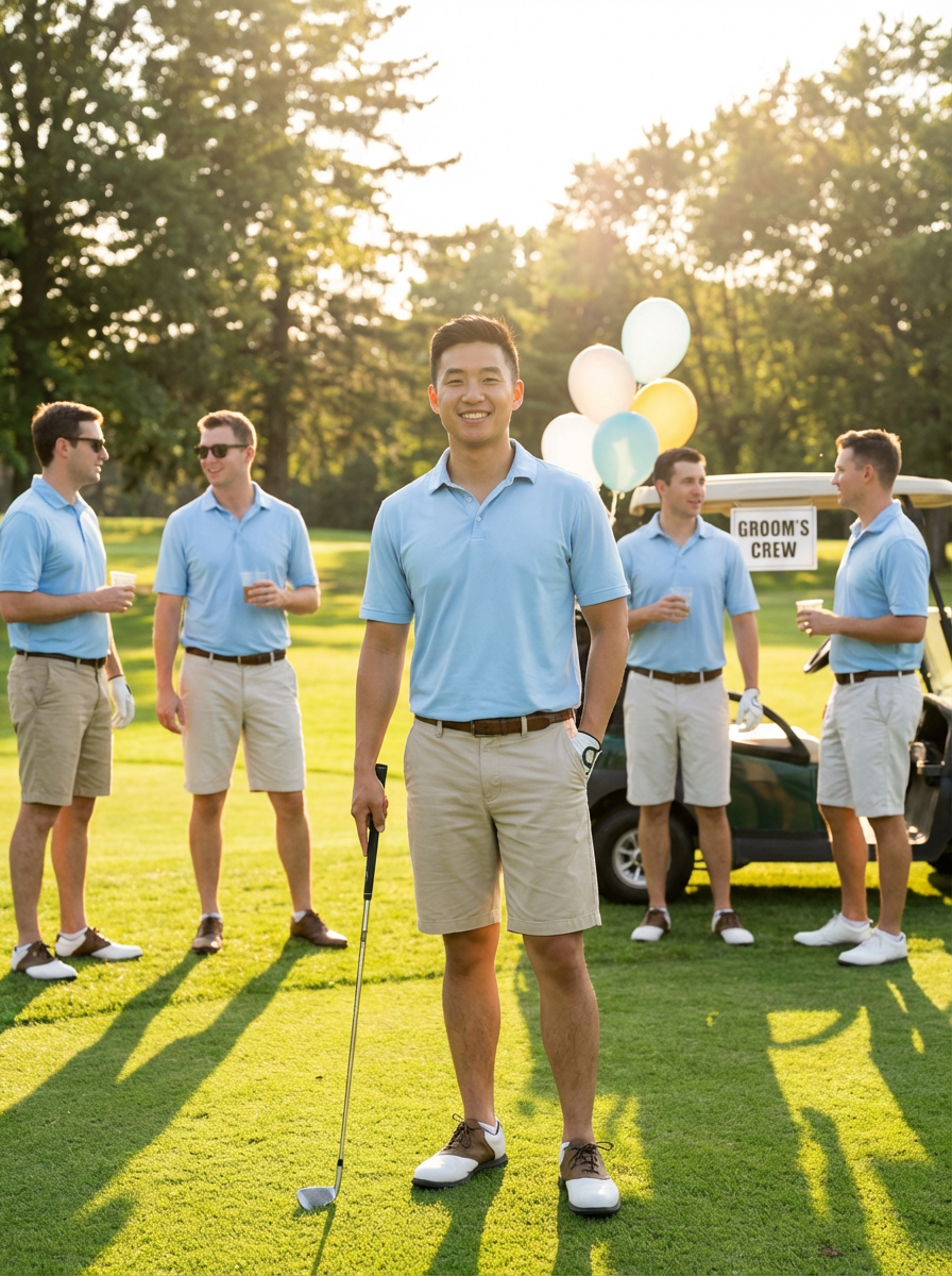 model golfing at bachelor party, golf course setting, polo shirt, sunny day, relaxed celebration