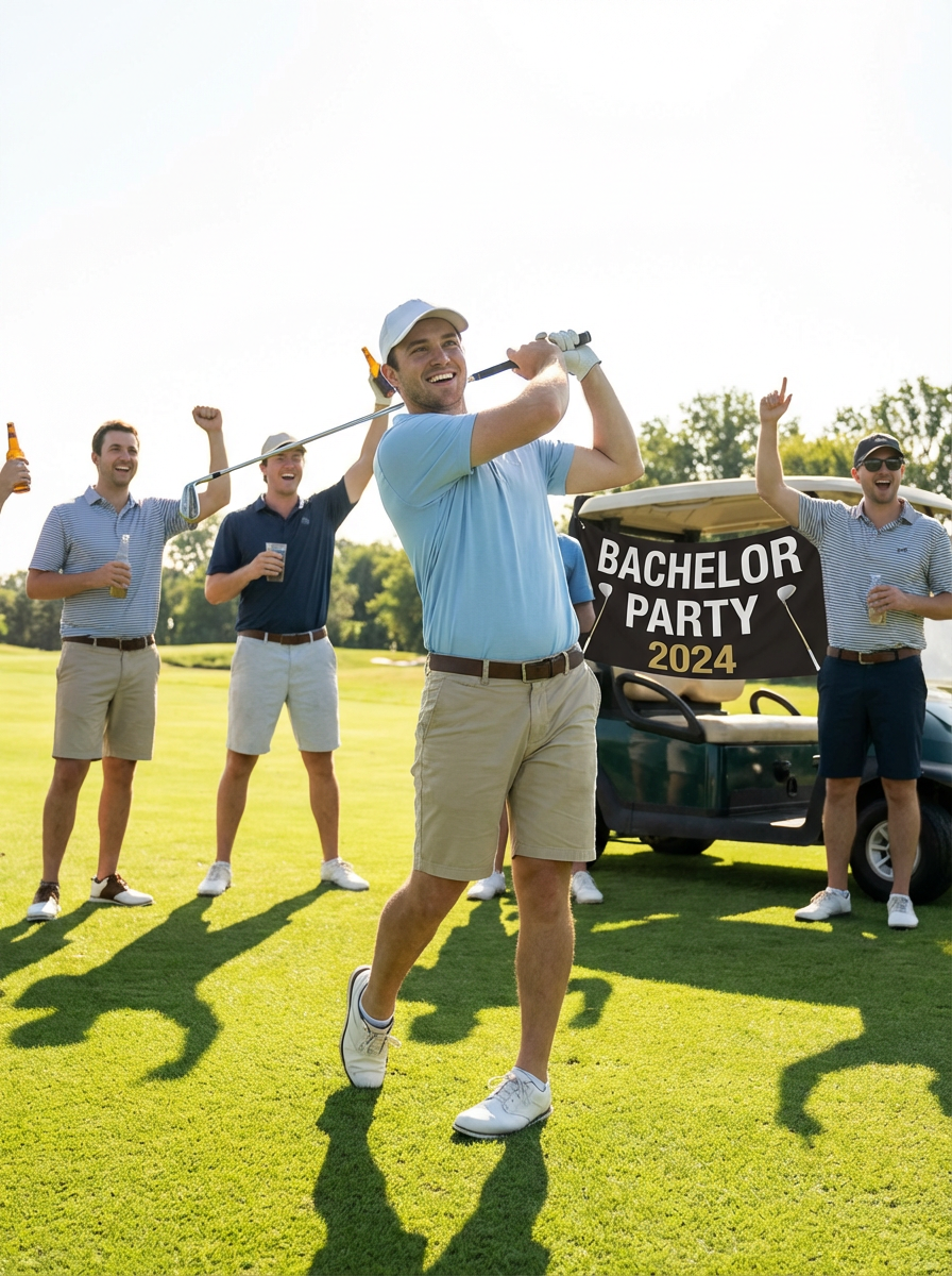 model golfing at bachelor party, golf course setting, polo shirt, sunny day, relaxed celebration