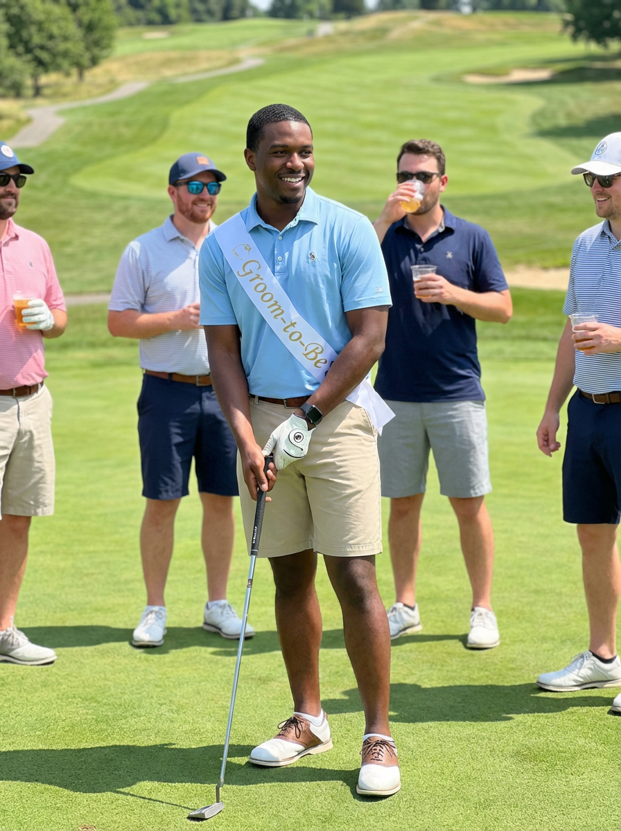 model golfing at bachelor party, golf course setting, polo shirt, sunny day, relaxed celebration