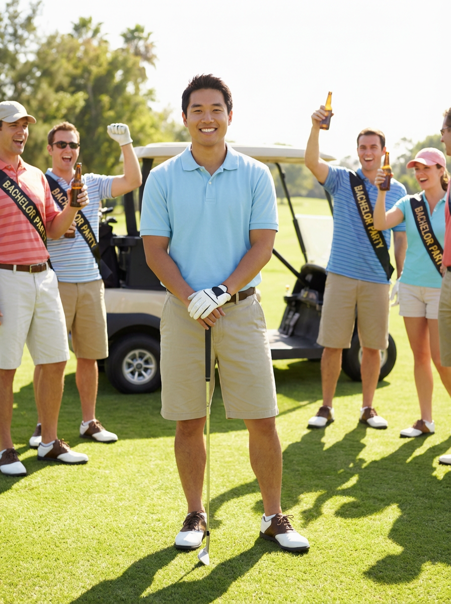 model golfing at bachelor party, golf course setting, polo shirt, sunny day, relaxed celebration
