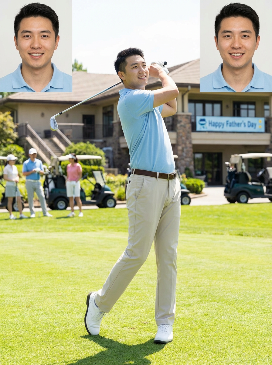 model golfing, Fathers Day activity, golf course background, sporty casual attire, sunny day