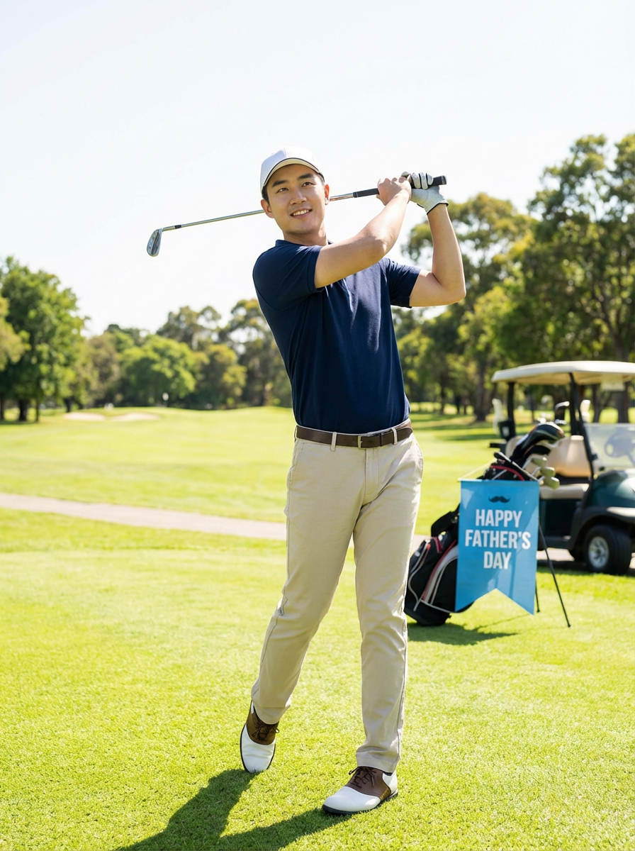 model golfing, Fathers Day activity, golf course background, sporty casual attire, sunny day