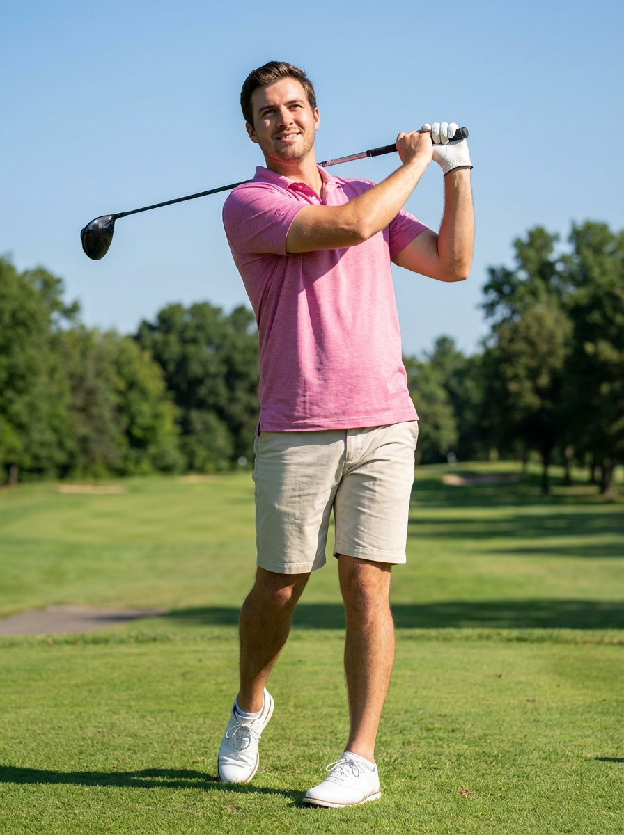 model golfing, Fathers Day activity, golf course background, sporty casual attire, sunny day