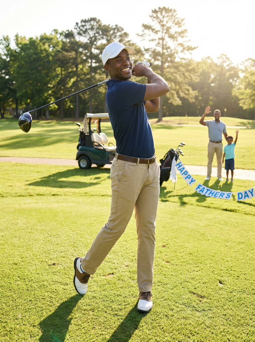 model golfing, Fathers Day activity, golf course background, sporty casual attire, sunny day