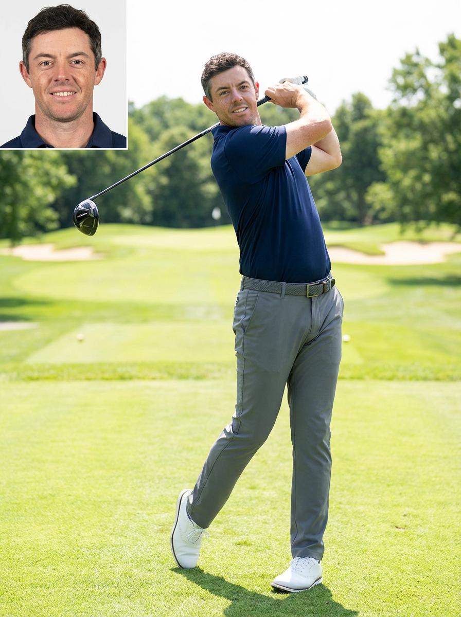 model golfing, Fathers Day activity, golf course background, sporty casual attire, sunny day