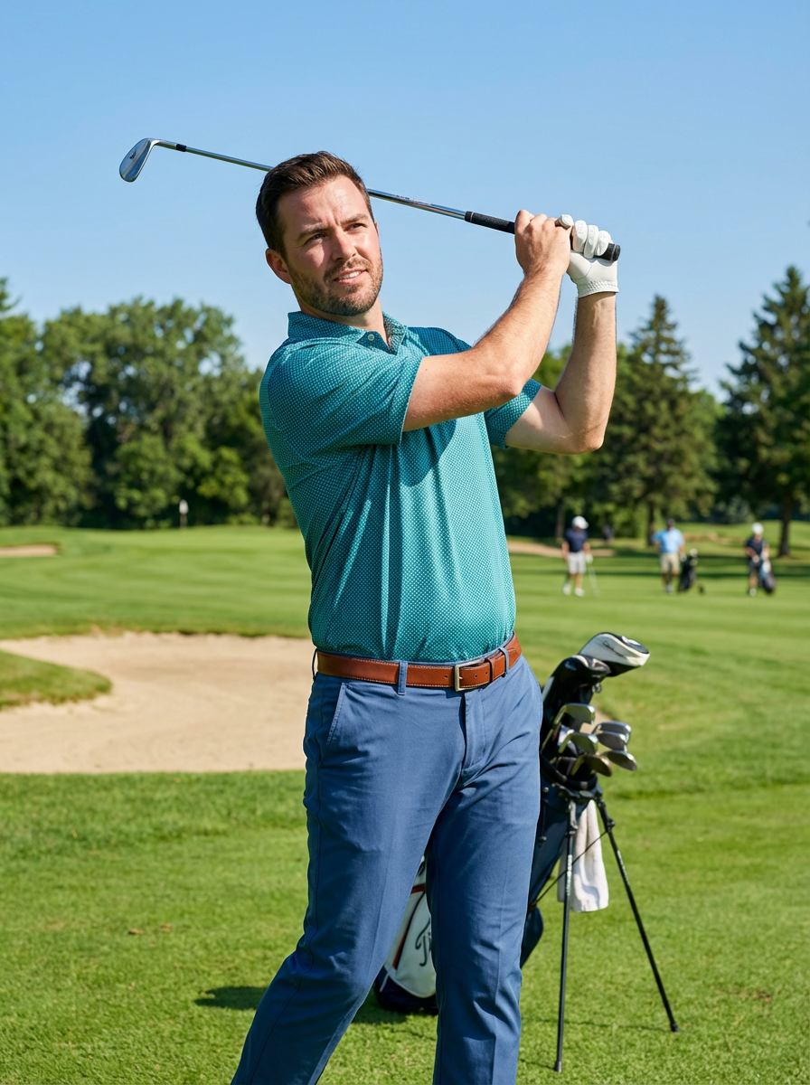 model golfing, Fathers Day activity, golf course background, sporty casual attire, sunny day