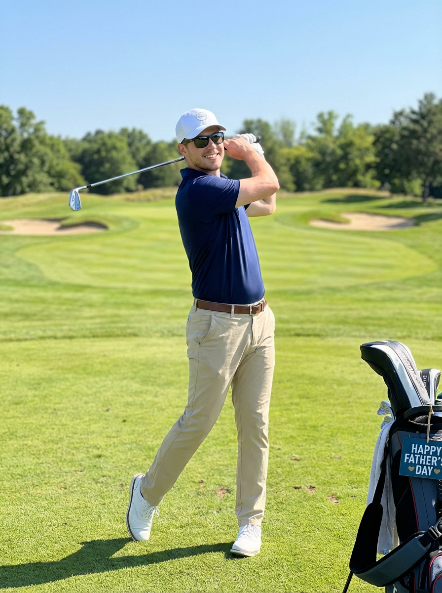 model golfing, Fathers Day activity, golf course background, sporty casual attire, sunny day