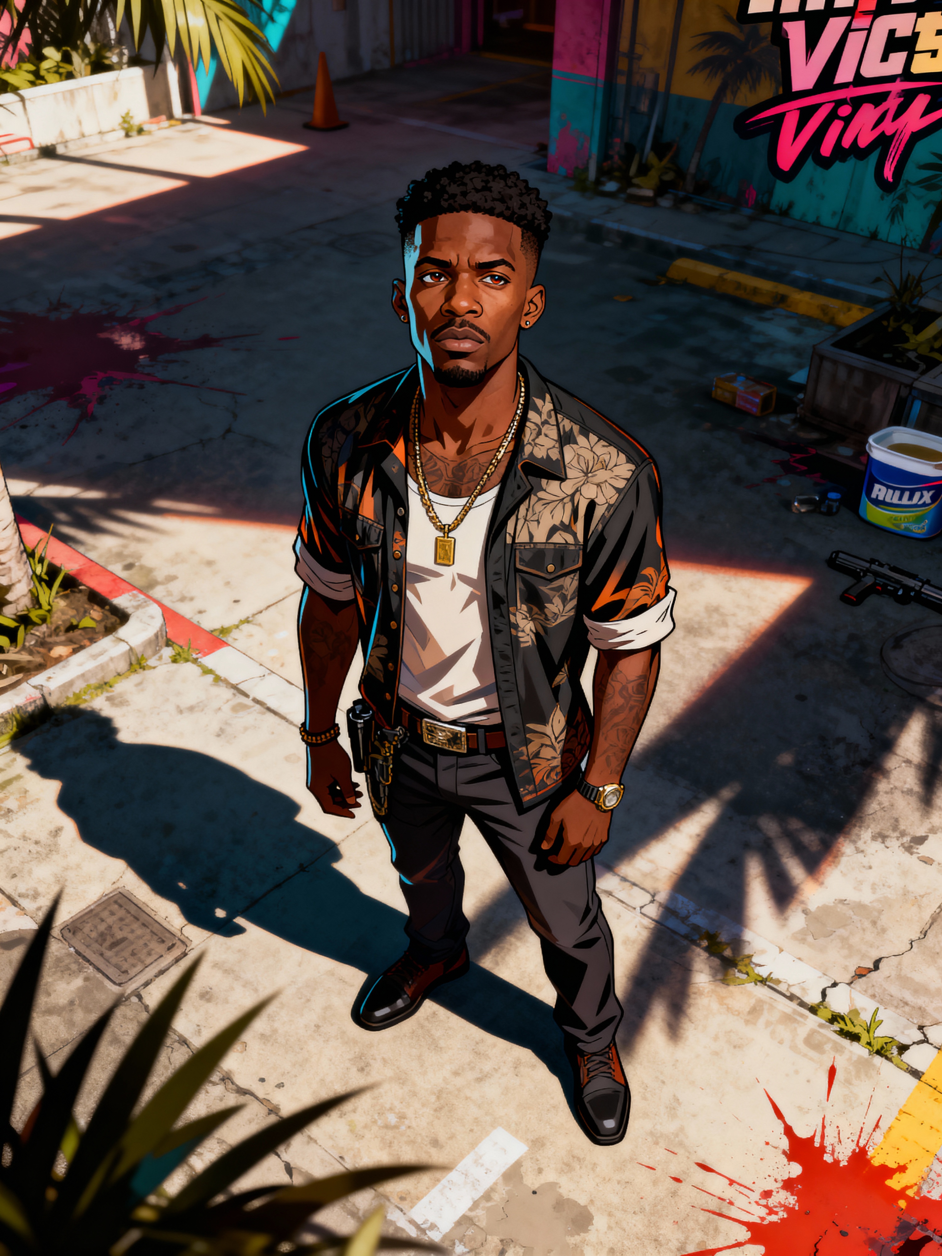model, gta vice city cover art, borderlands style, celshading, trending on artstation, by rhads, andreas rocha, rossdraws, makoto shinkai, laurie greasley, lois van baarle, ilya kuvshinov and greg rutkowski