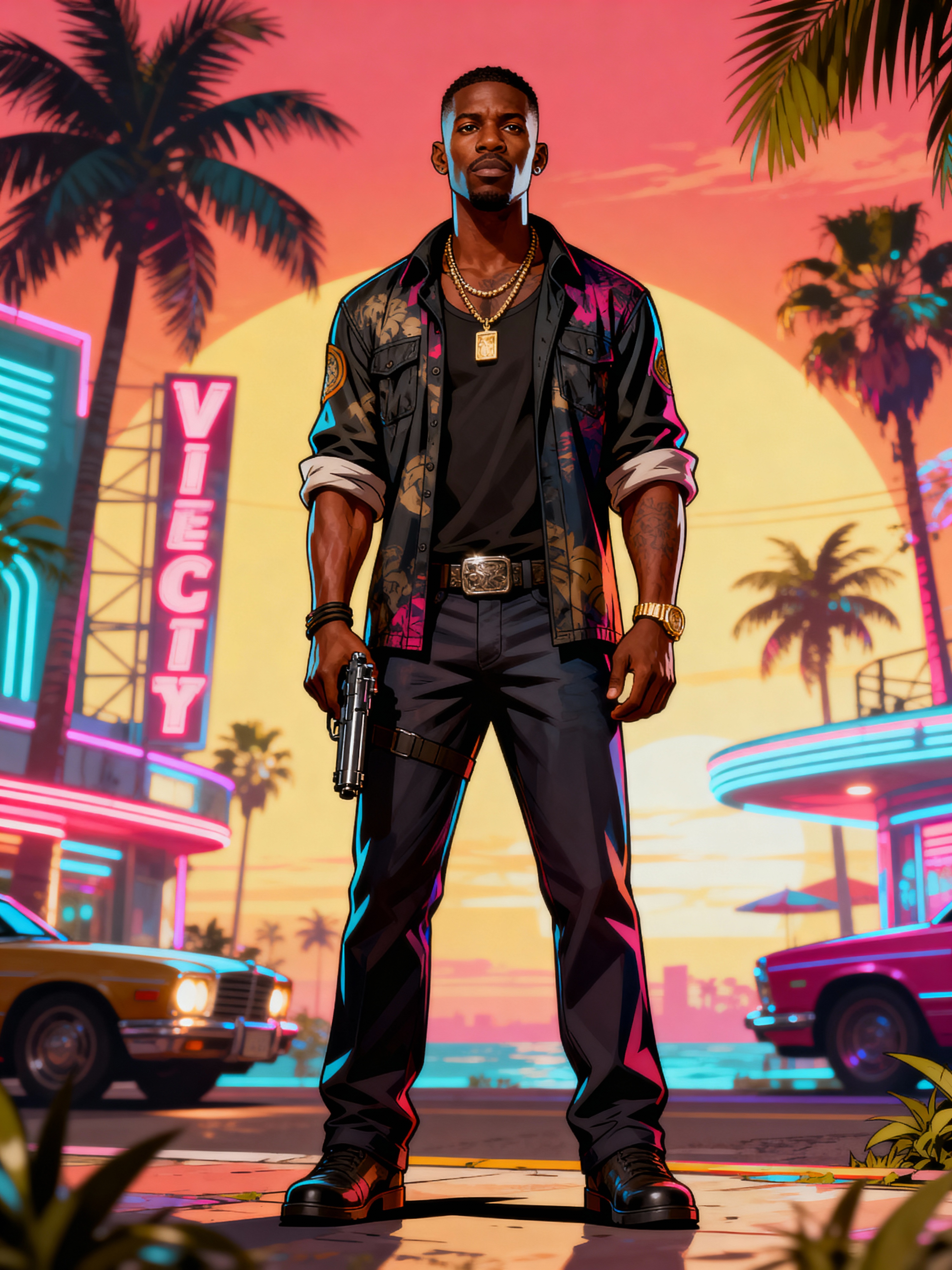 model, gta vice city cover art, borderlands style, celshading, trending on artstation, by rhads, andreas rocha, rossdraws, makoto shinkai, laurie greasley, lois van baarle, ilya kuvshinov and greg rutkowski
