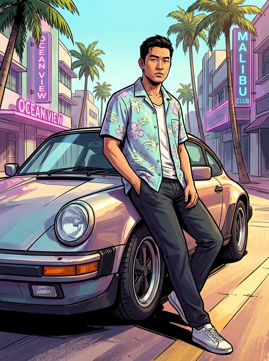 model, gta vice city cover art, borderlands style, celshading, trending on artstation, by rhads, andreas rocha, rossdraws, makoto shinkai, laurie greasley, lois van baarle, ilya kuvshinov and greg rutkowski
