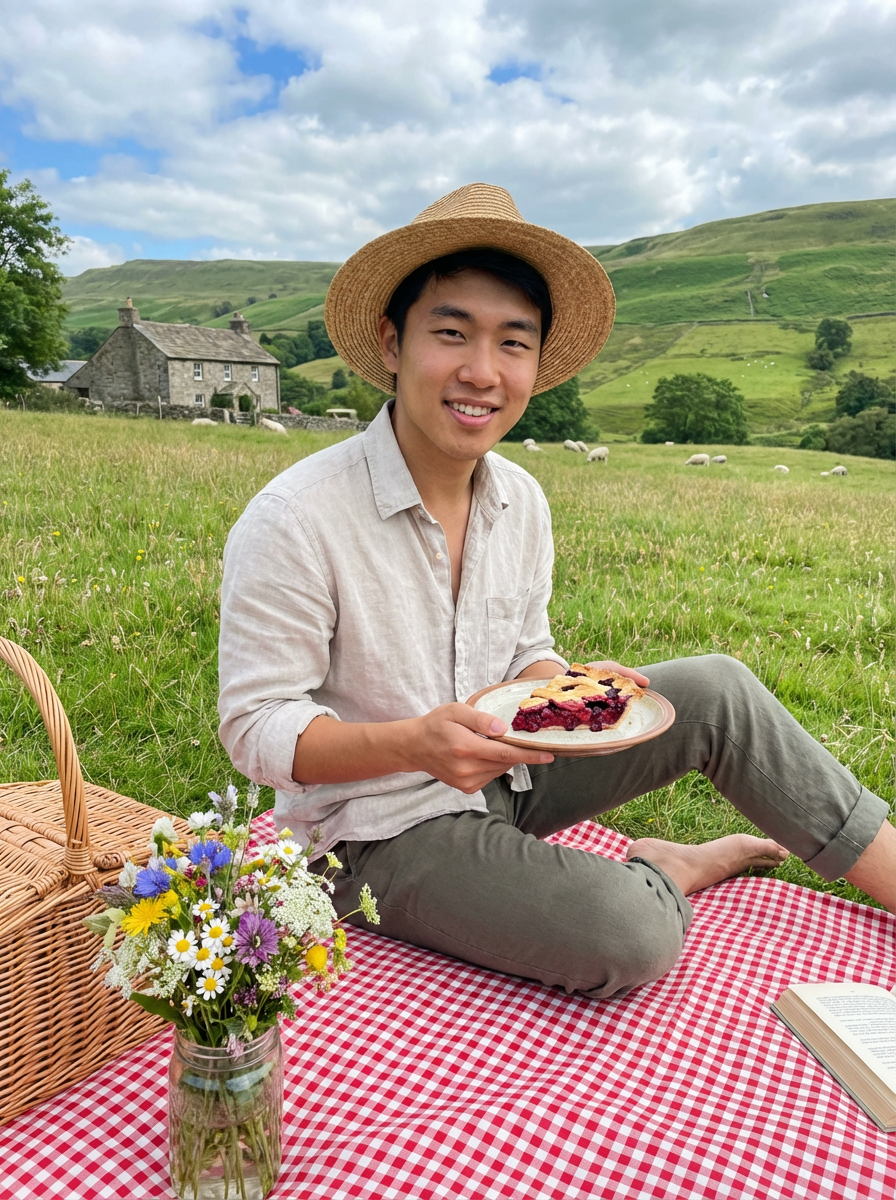model having cottagecore picnic, gingham blanket, homemade pie, wildflower bouquet, pastoral countryside