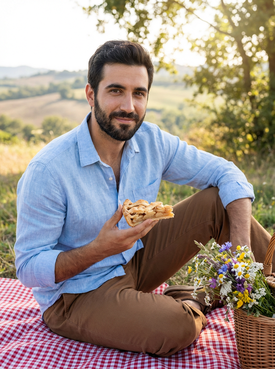 model having cottagecore picnic, gingham blanket, homemade pie, wildflower bouquet, pastoral countryside
