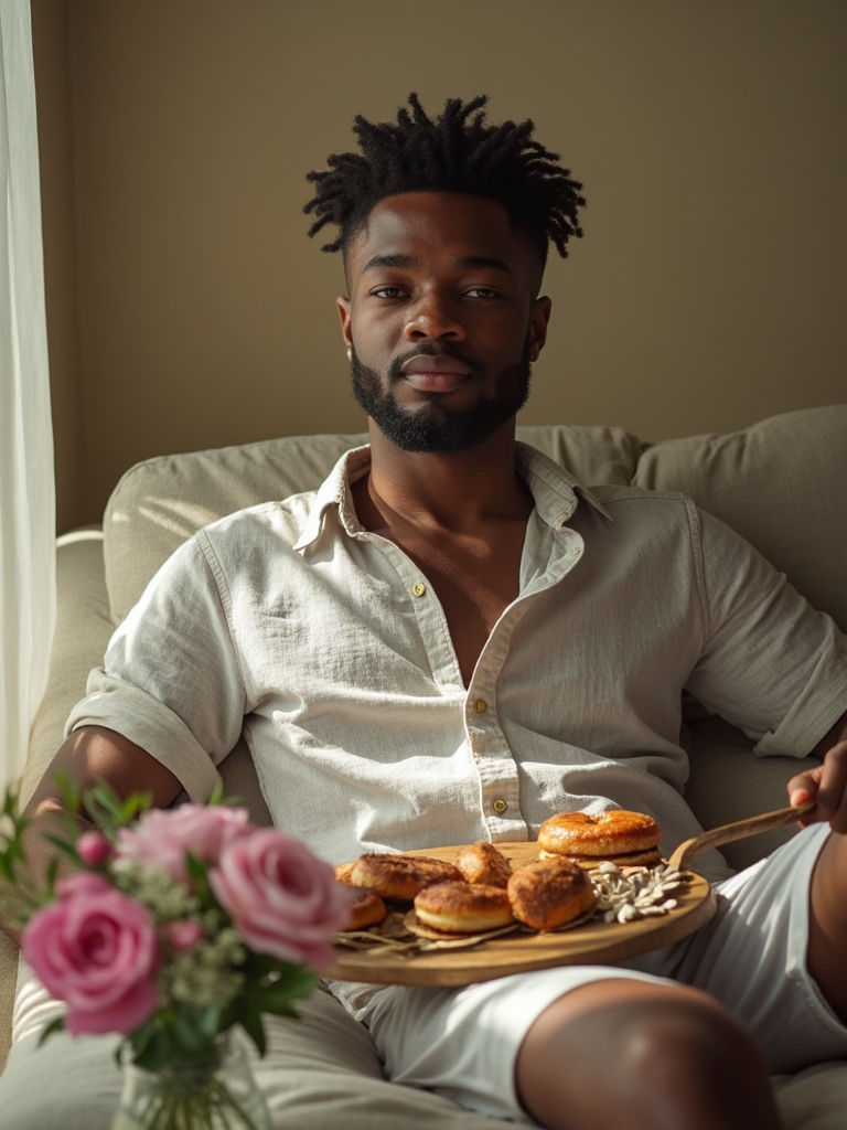 model having picnic in bedroom, wearing casual linen shirt and shorts, fresh pastries and flowers on vintage tray, soft natural lighting, dreamy aesthetic