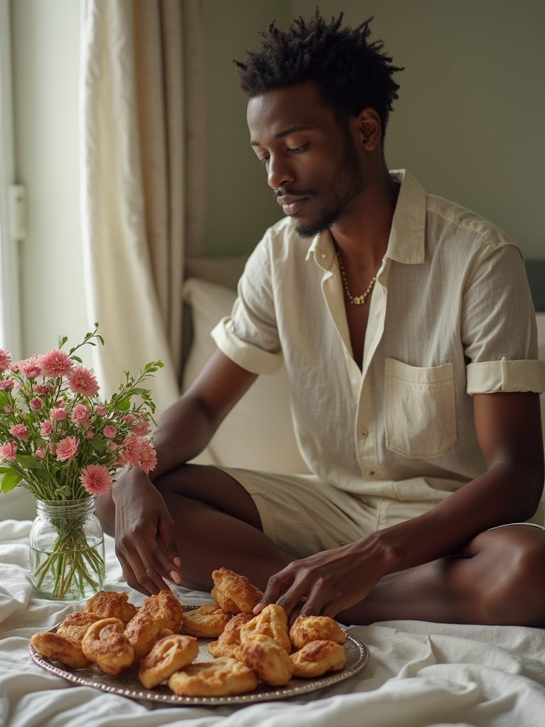 model having picnic in bedroom, wearing casual linen shirt and shorts, fresh pastries and flowers on vintage tray, soft natural lighting, dreamy aesthetic