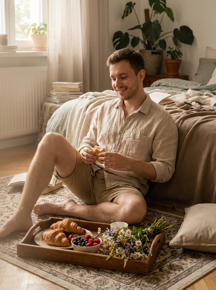 model having picnic in bedroom, wearing casual linen shirt and shorts, fresh pastries and flowers on vintage tray, soft natural lighting, dreamy aesthetic