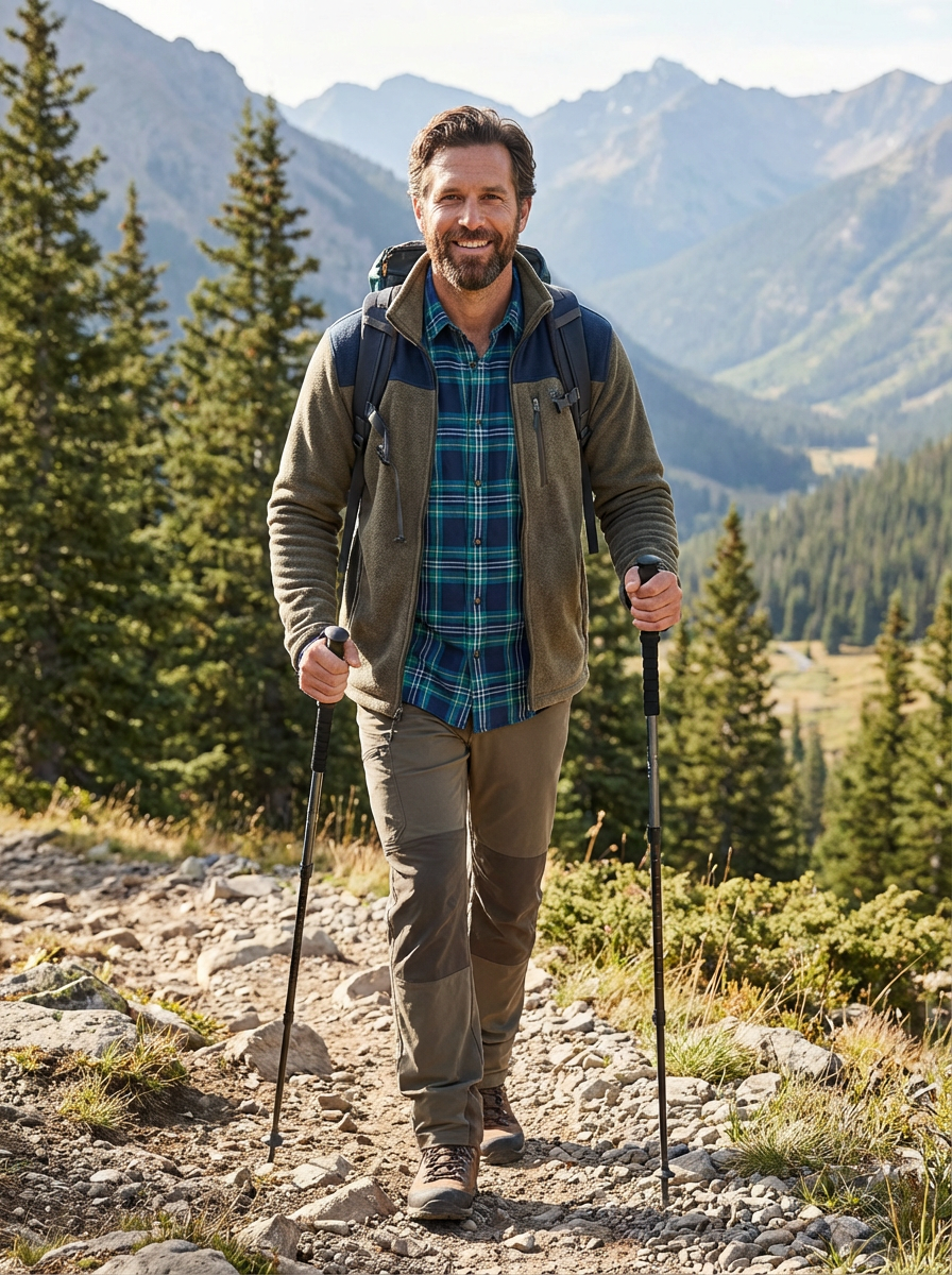 model hiking or in nature, adventurous spirit, outdoor casual wear, beautiful landscape