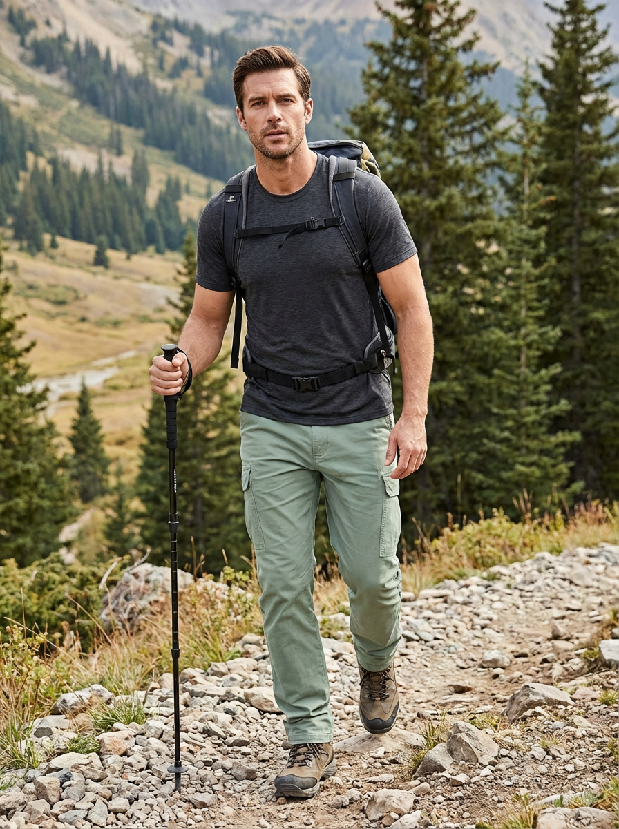 model hiking or in nature, adventurous spirit, outdoor casual wear, beautiful landscape