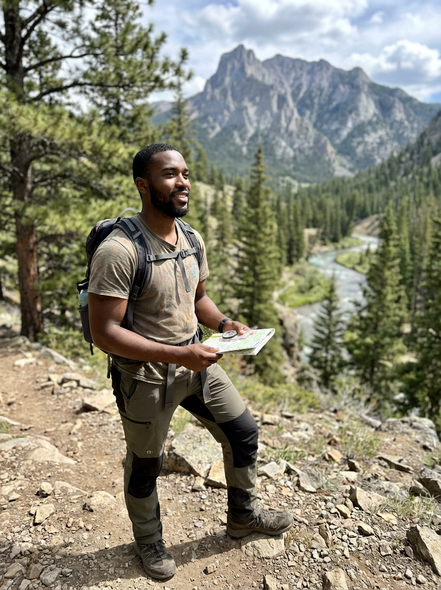 model hiking or in nature, adventurous spirit, outdoor casual wear, beautiful landscape