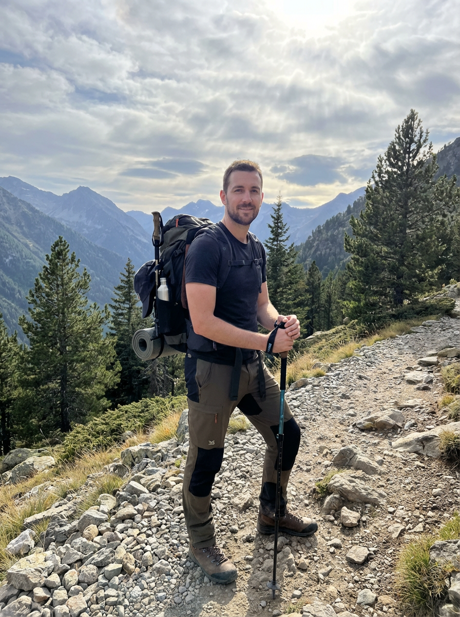model hiking or in nature, adventurous spirit, outdoor casual wear, beautiful landscape