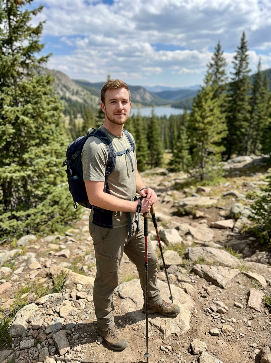 model hiking outdoors, adventure lifestyle, athletic casual wear, scenic nature background
