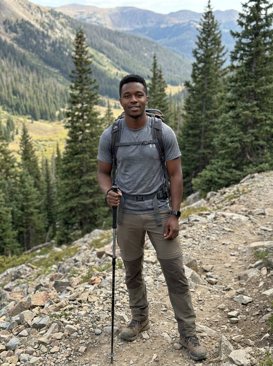 model hiking outdoors, adventure lifestyle, athletic casual wear, scenic nature background