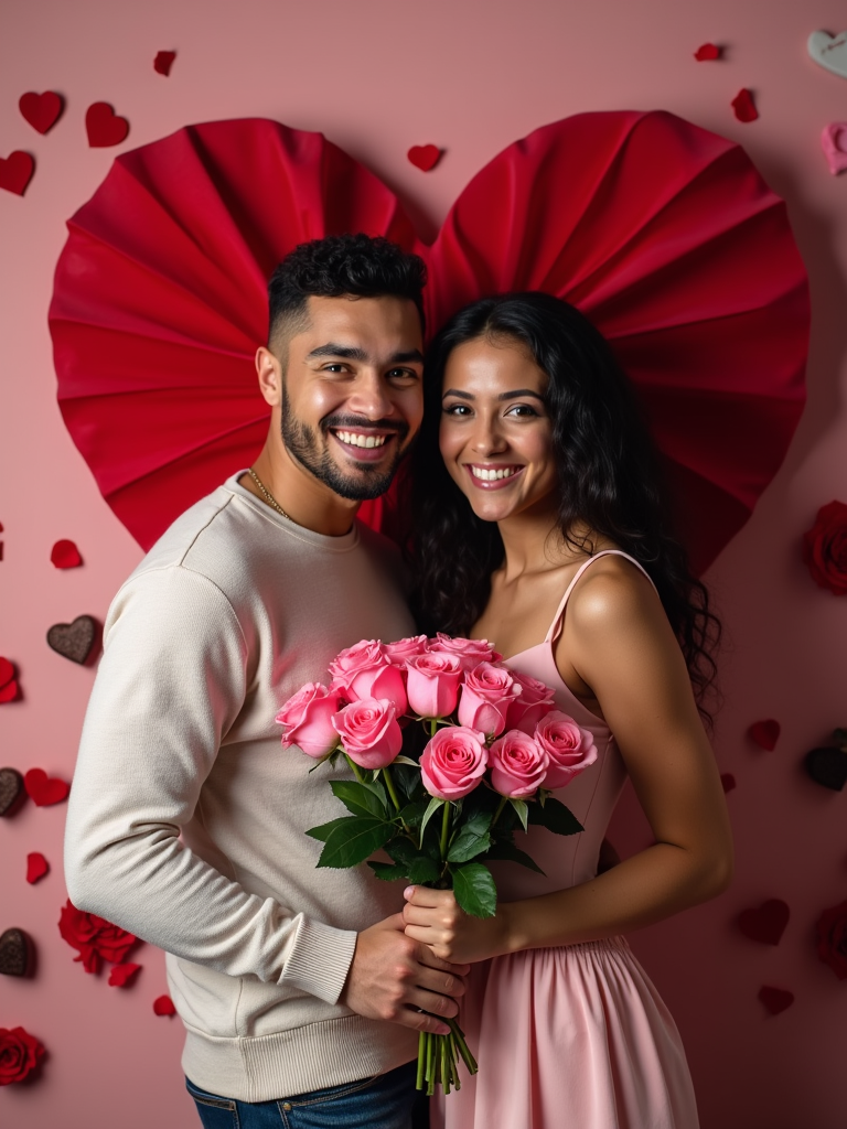 model holding a bouquet of roses, smiling in front of a heart-shaped backdrop with valentine's day decorations like chocolates and rose petals.