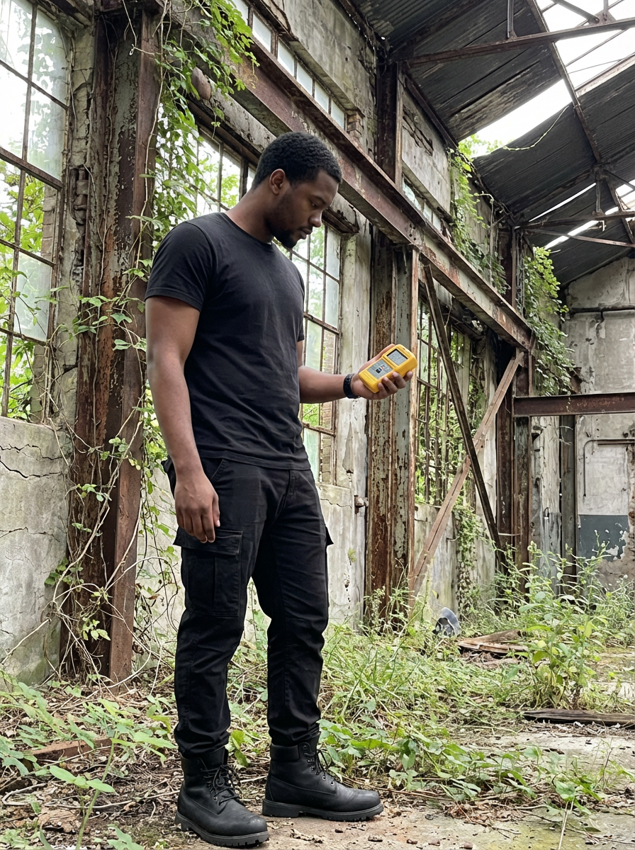 model holding a handheld small yellow geiger counter in desolate abandoned rusty building with overgrown nature. wearing black boots and black pants.