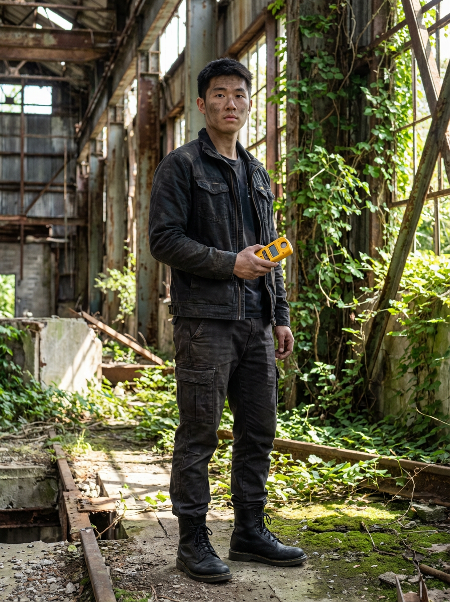 model holding a handheld small yellow geiger counter in desolate abandoned rusty building with overgrown nature. wearing black boots and black pants.