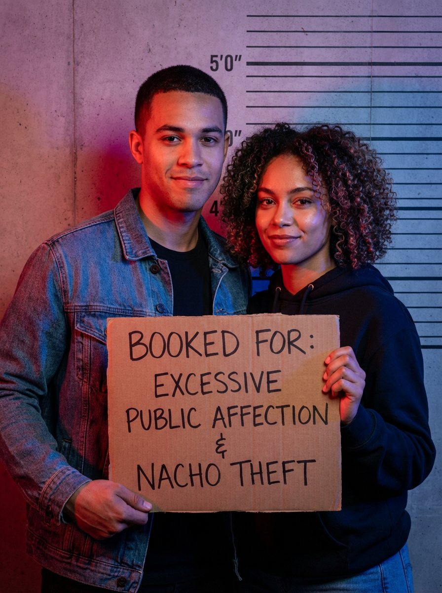 model holding funny custom booking sign, smirking expression, dramatic police lighting, mugshot composition