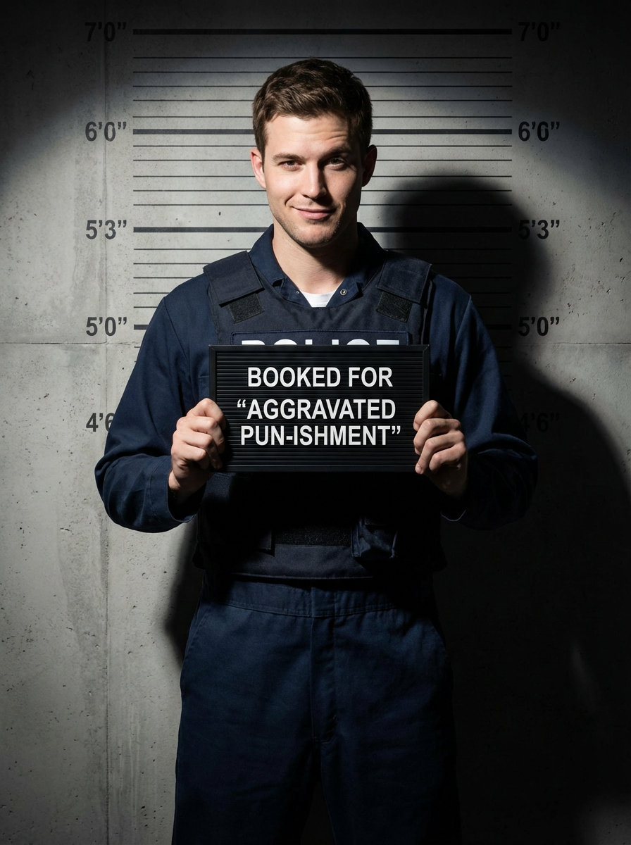 model holding funny custom booking sign, smirking expression, dramatic police lighting, mugshot composition