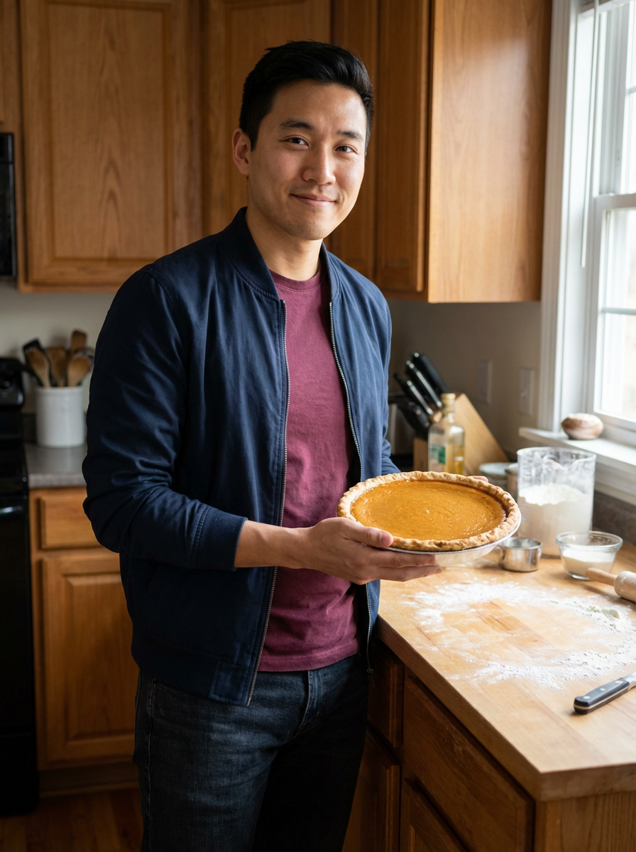 model holding pumpkin pie, kitchen setting, casual fall attire, baking scene