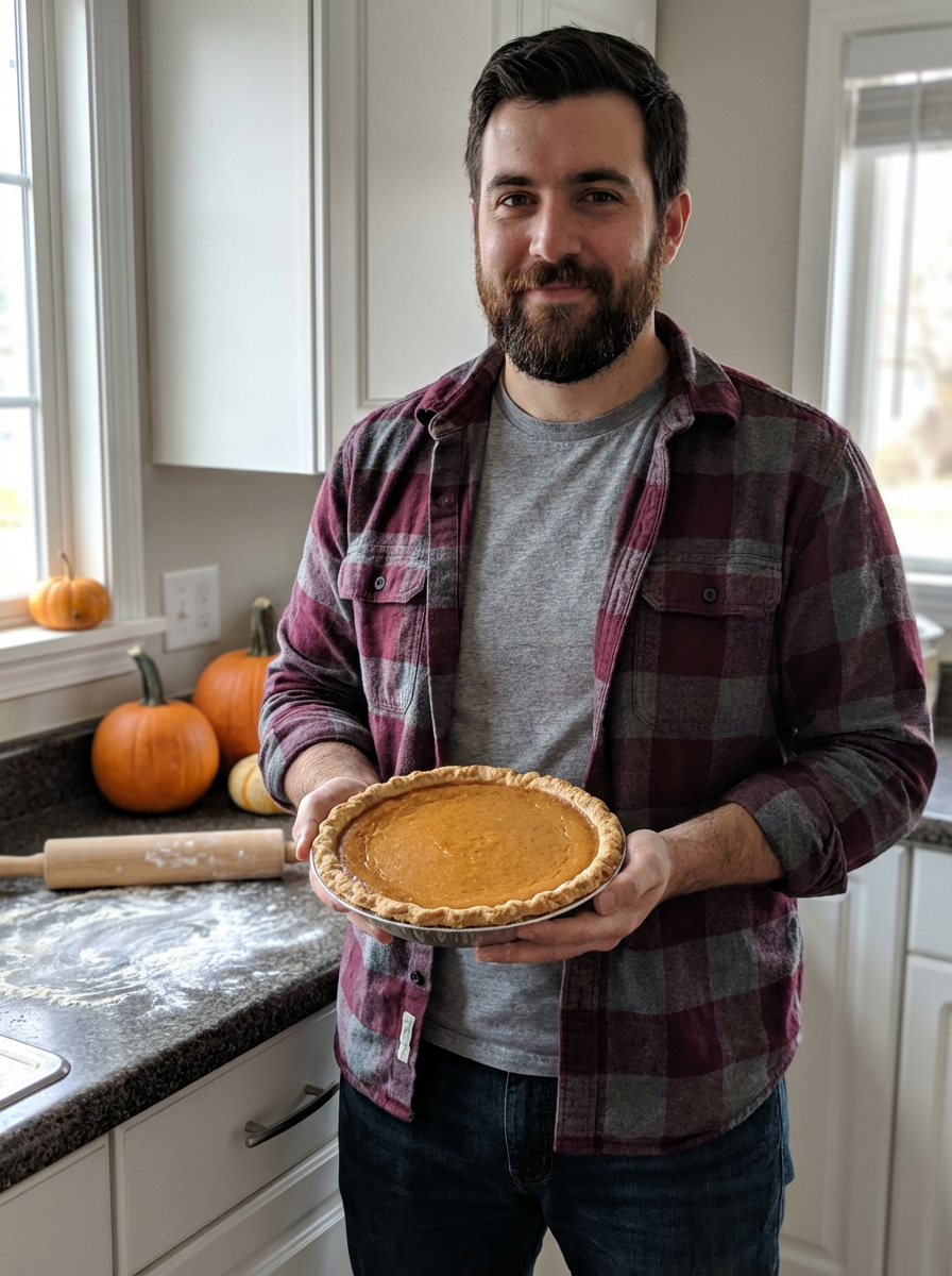 model holding pumpkin pie, kitchen setting, casual fall attire, baking scene