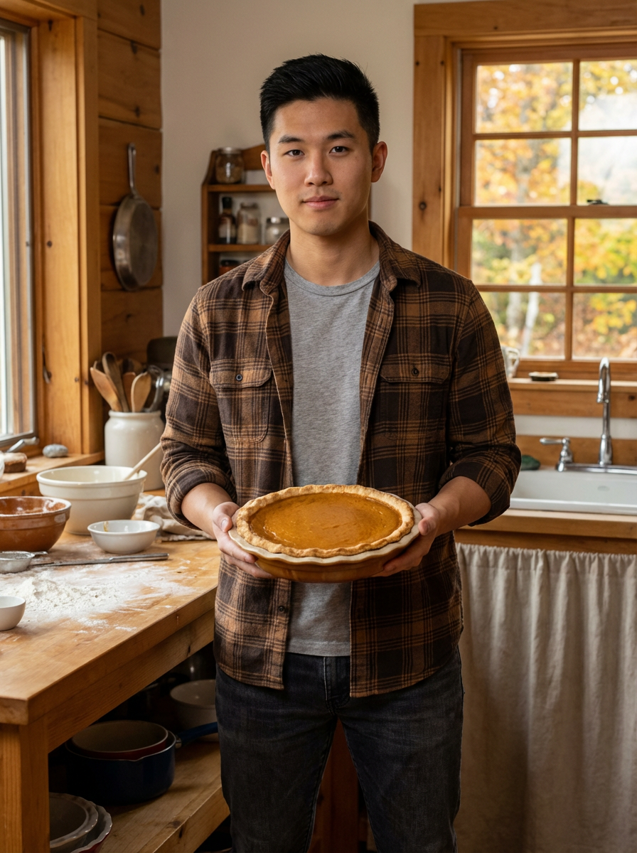 model holding pumpkin pie, kitchen setting, casual fall attire, baking scene