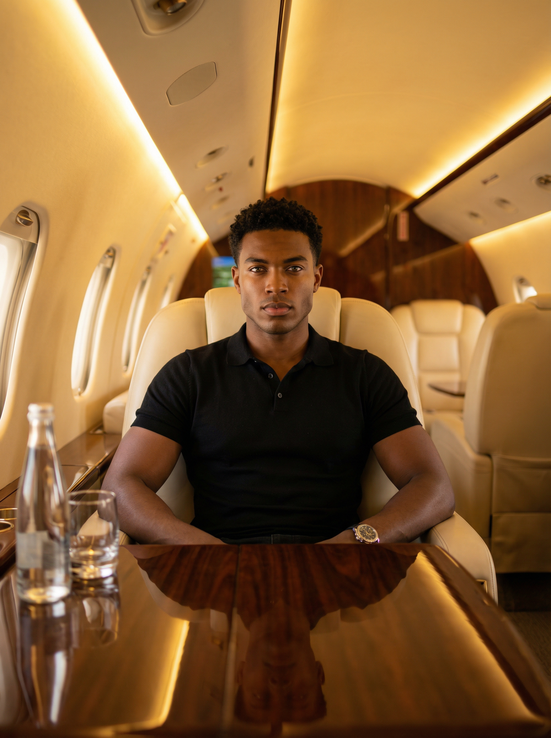 model, hyper-realistic luxury private jet portrait, seated centered in cream leather chair behind glossy wood table, warm golden cabin lighting, shallow depth of field; looksmaxxing looksmaxxer vibe; perfectly symmetrical face, sharp jawline, high cheekbones, straight nose, bright “hunter” eyes, thick brows, clear flawless skin texture, defined lips; short curly hair; wearing fitted black polo + watch, elite looksmaxxing model, muscular physique (low body fat), symmetrical face, sharp jawline, high cheekbones, strong chin, bright intense gaze, thick groomed brows, clear even skin with healthy glow, subtle tasteful contour ; water bottle on table; 35mm, f/2